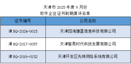 根据中国软件行业协会《软件企业评估标准》(T/SIA002-2019)、《国家鼓励的软件企业评估标准》(T/SIA025-2021)以及天津市软件行业协会《天津市软件企业评估申报须知》有关规定,《软件企业证书》或《国家鼓励的软件企业证书》有效期为一年,有效期届满前企业需进行复评,未申请复评的《软件企业证书》或《国家鼓励的软件企业证书》将自动失效。